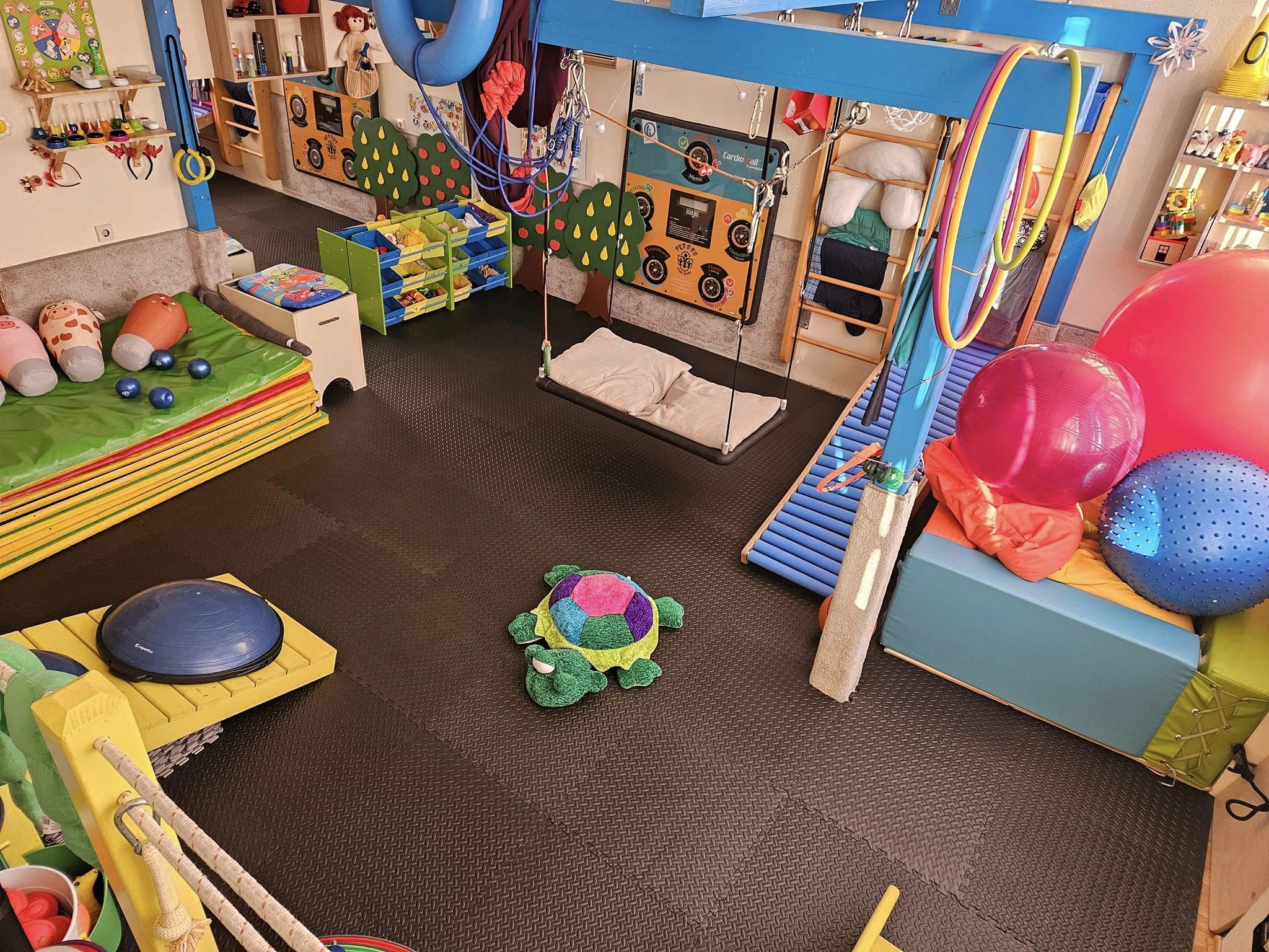 Разполагаме с разнообразно оборудване: различни видове люлки, платформа за изкачване и пързаляне, шведски стени, басейн с топки и различни игри. Оборудването се обновява и обогатява съобразно нуждите на програмата, като се обезпечава възможността за предоставяне на различни видове сензорно стимулиране.